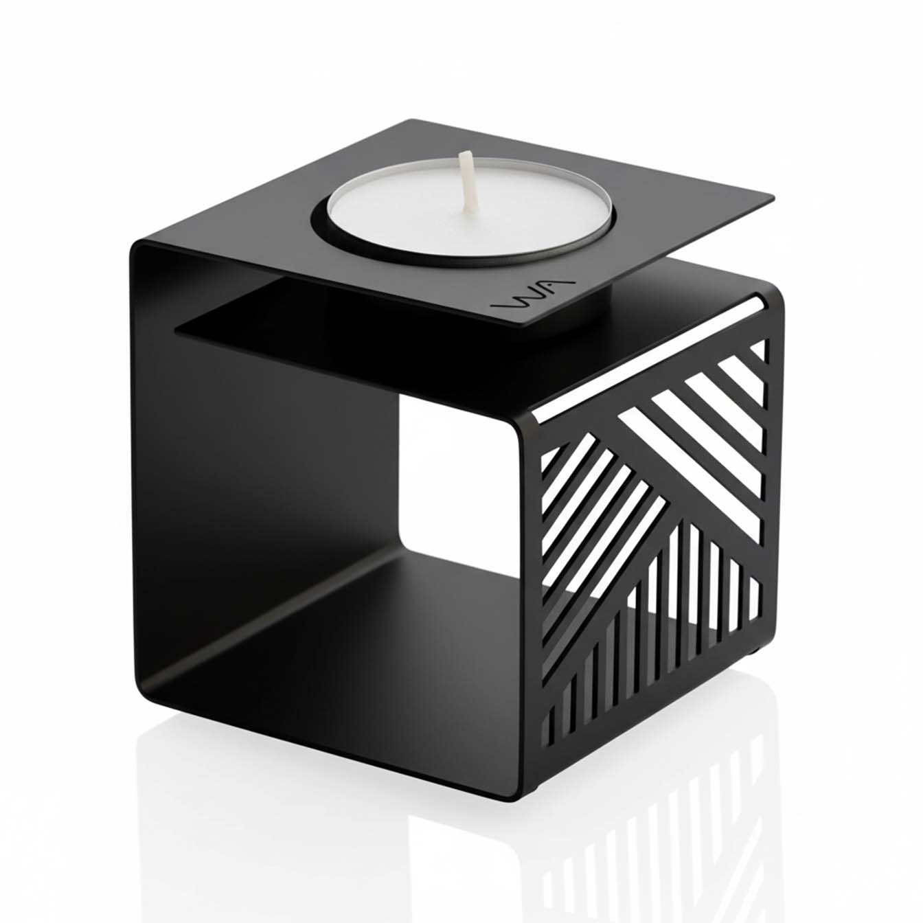 Bring a warm and modern glow to your space with this geometric metal tealight holder. Crafted from durable powder-coated steel, its minimalist cube design with stylish cut-out patterns adds a touch of sophistication to any setting. Perfect for living rooms, dining tables, bedrooms, or as a chic gift for loved ones.